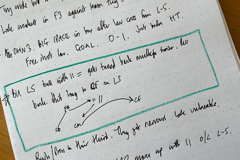 Another restart, this time involving another player. A chance to note how that defender or midfielder operated. All right, I would think. That worked well (or didn’t)… They look stronger there (or weaker)... He looks comfortable on the ball (or doesn’t)... He’s stronger going forward than in defence…